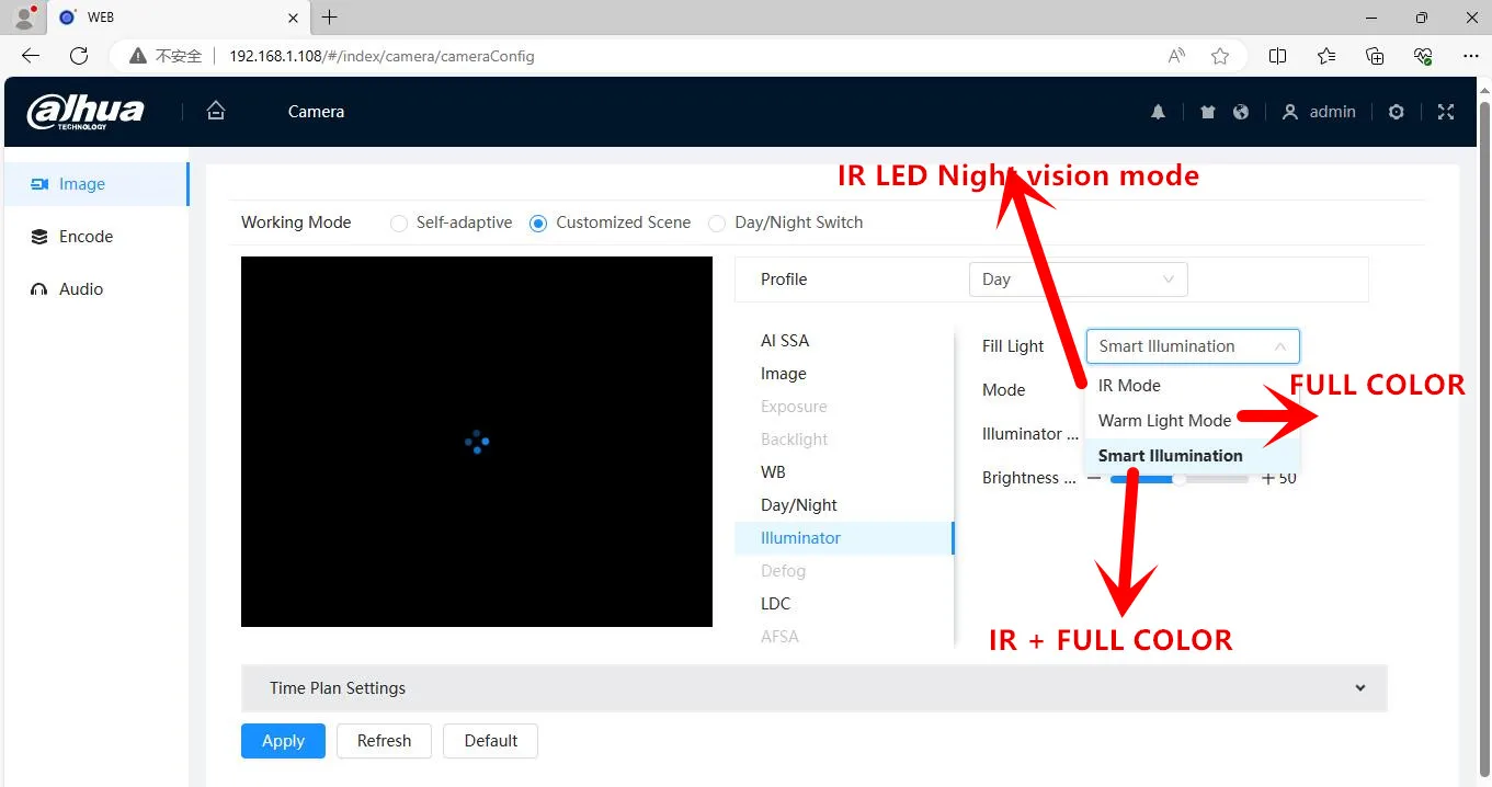 > Built-in warm light and IR LED; the max. IR illumination distance is 30 m and warm light distance is 30 m.